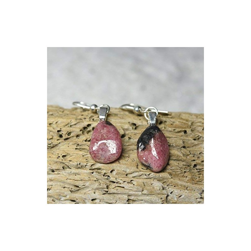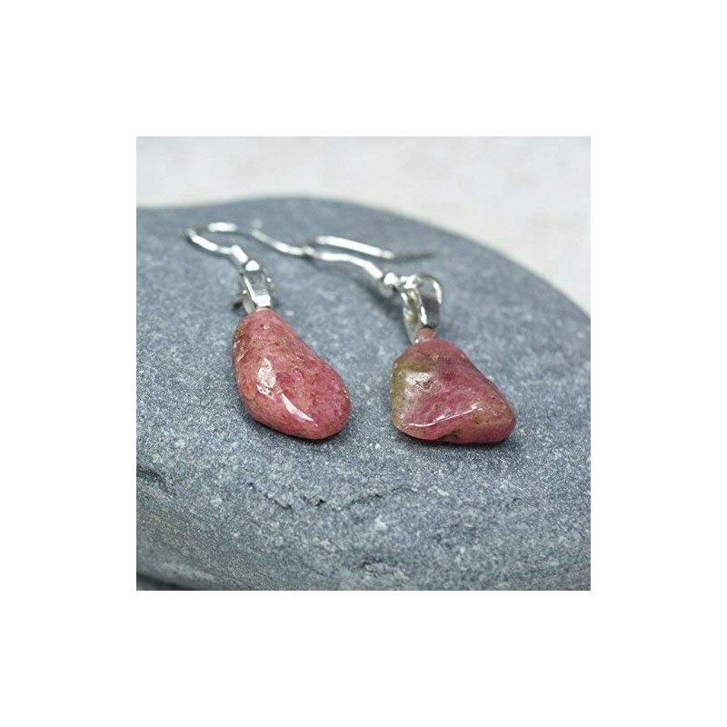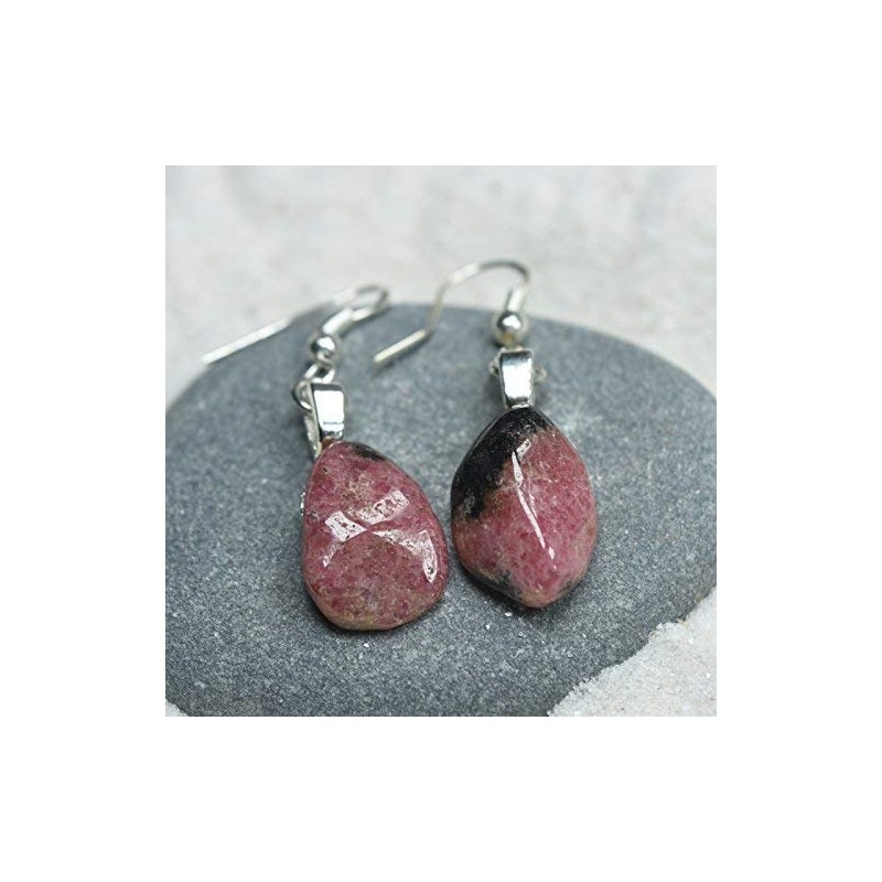 Fantastic handmade tumbled rhodonite stone dangling sterling silver earrings. The rhodonite stones are mounted on sterling silver french hooks. The earrings have sterling silver french hooks and are made with genuine rhodonite stones. The earrings are hand made in the USA. It comes from a smoke free environment The rhodonite stone earrings measure: 14 mm x 8 mm x 8 mm or .55 inches x .4 inches x .4 inches. Please note, each set of earrings are handmade with genuine stones, so each pair and set of earrings are unique. No two sets are exactly the same. The measurements are approximates. Also, because the stones are natural / genuine the earrings are not identical. While the stones are selected due to their similar shape, color and texture there are some minor differences, that are found in genuine minerals / gemstones.