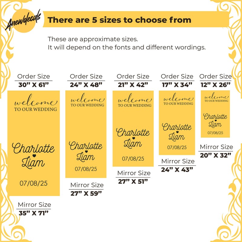 - MULTIPLE SIZE OPTIONS. Available in 30" X 61", 24" X 48", 21" X 42", 17" X 34", and 12" X 26", our wedding decals for mirrors fit perfectly on any surface, creating a custom welcome sign for wedding.