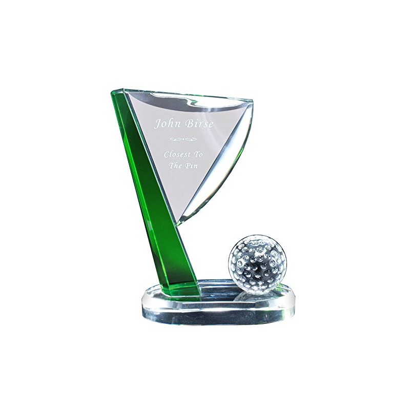 Item Description: Optical cut crystal golf flag and ball award with beveled cut edges and green accents. Size 7-1/2 inch (height) x 6 inch (width). Laser Engraving Options: Engraving price includes plain text maximum of 7 lines of text or logo. Please enter text below or you can upload your logo via the Upload Artwork File or Engraving link below.