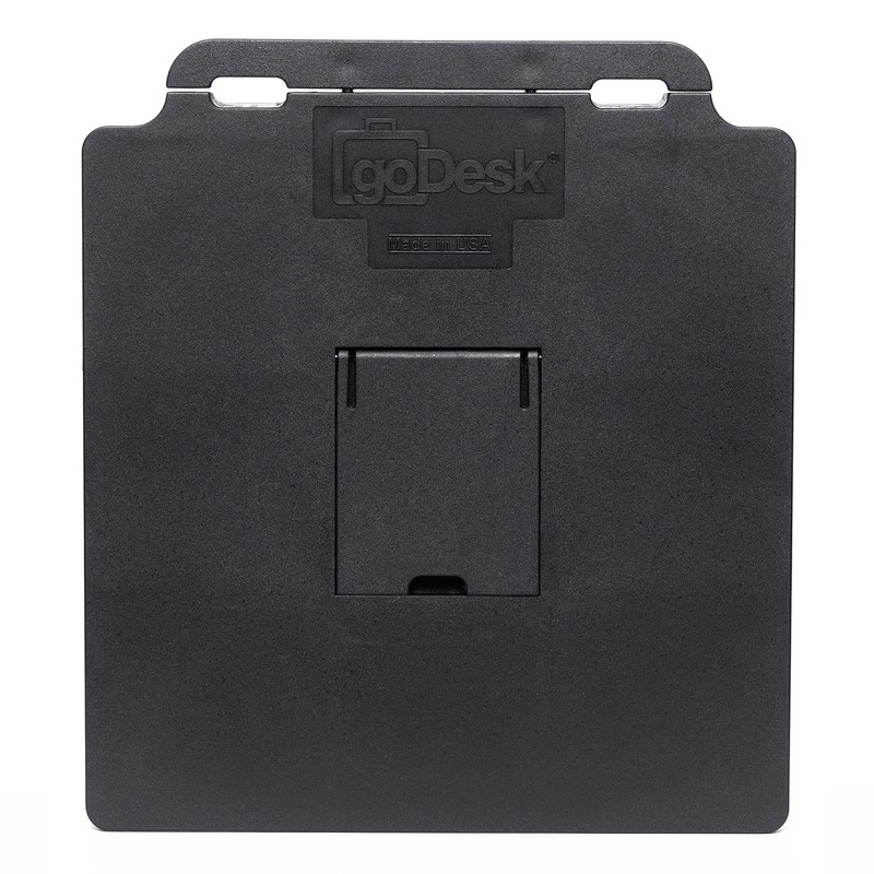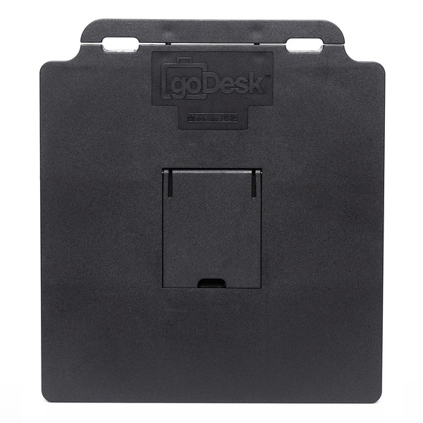 Create your space, anytime, anywhere with the goDesk® Attachable Luggage Desk Stand. It attaches to telescoping luggage handles to provide an instant table suitable for laptop, meals, or most anything requiring a stable surface. The goDesk® weighs only 1 lb., supports up to 12 lbs., and is equipped with a pop-up media stand and slide-out cup-holder for added use and convenience. It is made of TSA-approved materials in the USA.