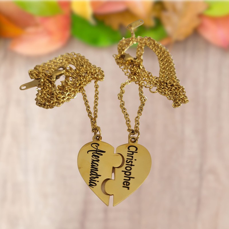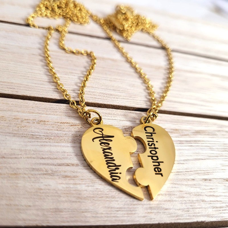 - Unbreakable Bond: This personalized interlocking puzzle heart pendant necklace pair symbolizes the unbreakable bond between two people. High-Quality Materials: Crafted from high-quality materials, these necklaces are durable and built to last - Gold