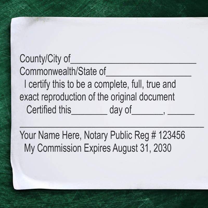 The stamp's housing is approximately the same size as the impression, making it easy to align the wording on the document. This stamp is used to supplement your notary seal or stamp. We guarantee our stamps meet your state specifications for notary stamps and supplemental stamps. You can choose from a standard Slim Pre-Inked Certified Copy stamp or have it personalized with your notary information. With our one to two-day turnaround, you will be imprinting your notary statements quicker than writing them out.