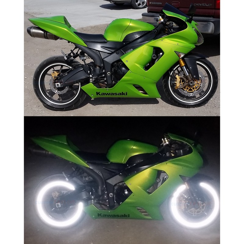 customTAYLOR33 High Intensity Grade Reflective Copyrighted Safety 8mm Width Rim Tapes. Simple and inexpensive do-it-yourself modification, with amazing results. This truly is an absolute must-have for any anything with wheels if you want to add safety to your ride, and to stand out! They reflect light back at the light source that shines on them (like incoming headlights), giving the glowing effect. Unique triangle patterns, with high "glass" gloss. The only rim tapes to reflect sunlight!! ALL reflective materials will tend to look more intense in pictures. Camera flashes can be more intense in a split second than other lights. LEGAL in most places since they are made for SAFETY and are NOT lights!! These are NOT "glow in the dark." RIM SIZE FOR BICYCLES Please be aware that the numbers on your bicycle tire is the tire size, not rim size, so you must follow these instructions to find your actual rim size: Measure the diameter of your rims, NOT tires, from edge to edge. Your measurement will always be UP TO 1" more than your actual rim size. For example, your measurement of a 22.1" to 23" diameter, means you have 22" rims. Therefore you should be ordering a 22" size rim tape. Also, rim tapes can only be applied to rims with disc brakes since you CANNOT have the pad brakes rub on the rim tapes. RIM SIZE FOR MOTOR VEHICLES (i.e. cars, motorcycles, etc.) The last two digits in the numbers imprinted on your tires is your rim size. For example, "180/55ZR17", means you have 17" rims.