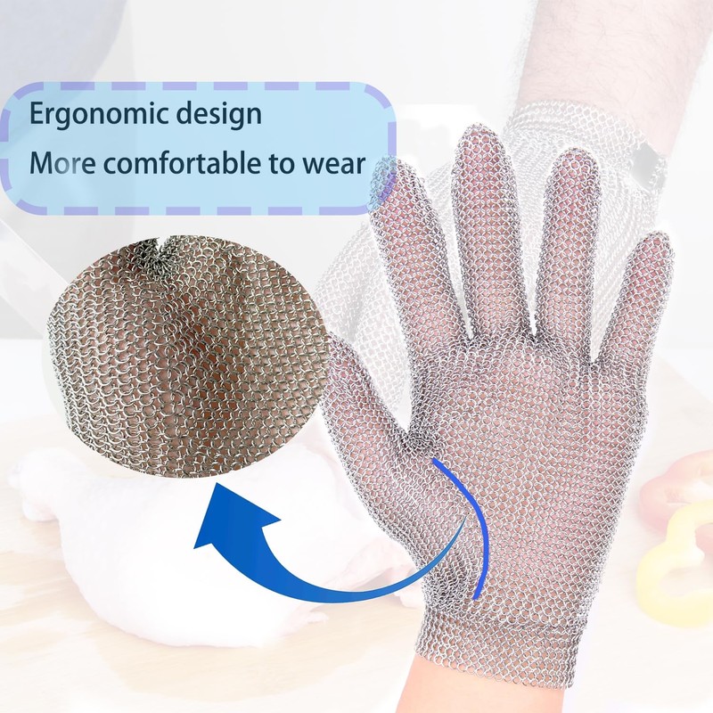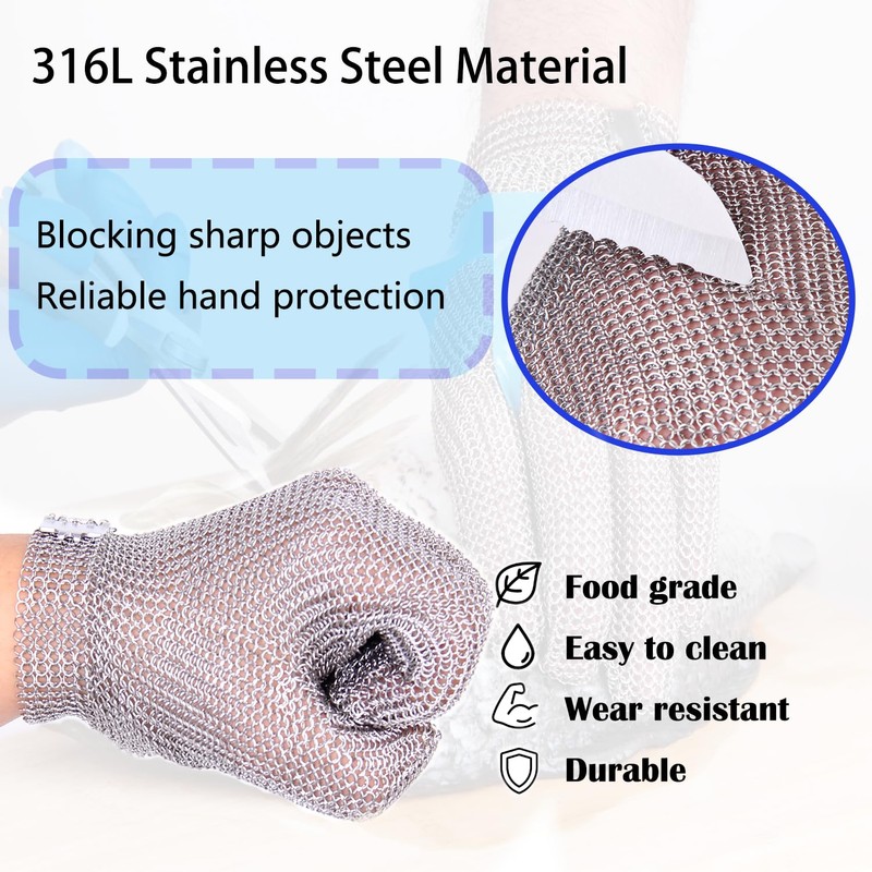 - Food Grade Stainless Steel - Chain mail gloves for cutting food grade made of 316L stainless steel are safe for direct contact with food. And each stainless steel ring of chainmail gloves for cutting has been welded, so the rings won't fall off during use, making them ideal gloves for handling ingredients.