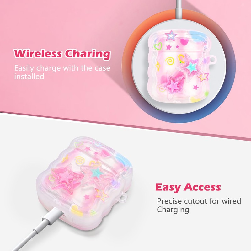 Cute AirPods Case with Love Pendant Colorful Round Bead Keychain, Glitter 3D Stars Design Soft Protective Cover Compatiable with AirPods 2nd & 1st Generation Case