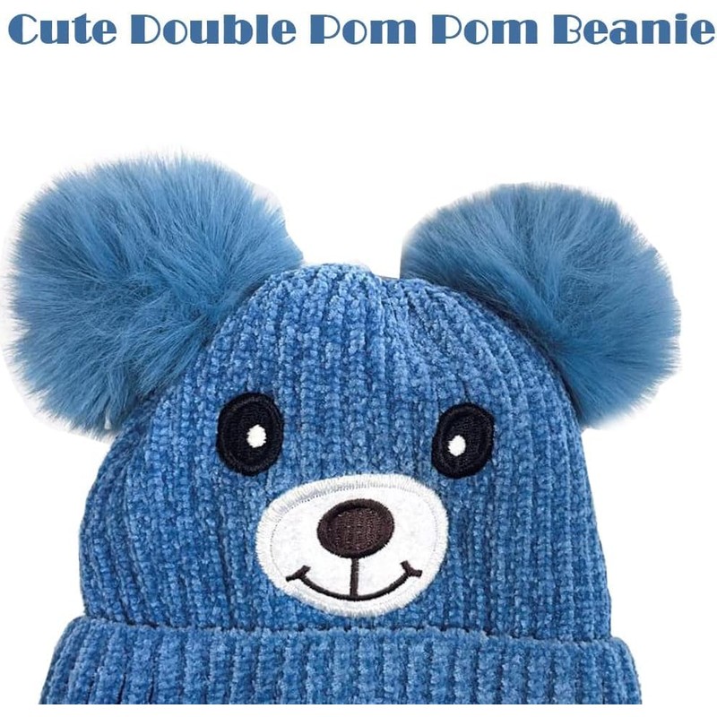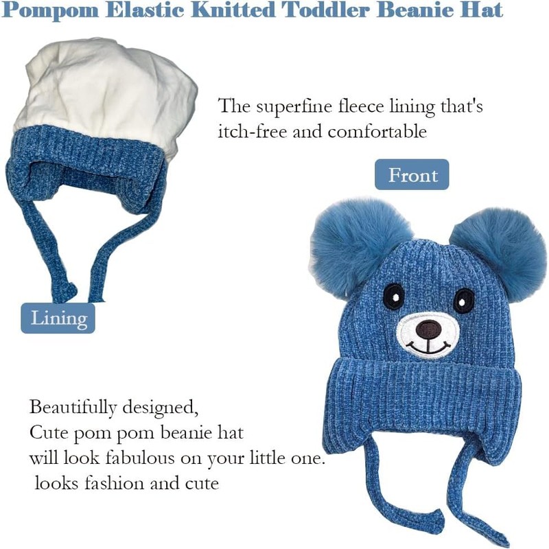 Cute Bear Kids Winter Hat with Ear Flaps 1-5 Years Dual Pom-Pom Chenille Knitted Warm Hat for Baby Girls Boys Fleece Lined Warm Earflap Cap with Strap Toddler Cold Weather Furry Warm Beanie Hat,Blue