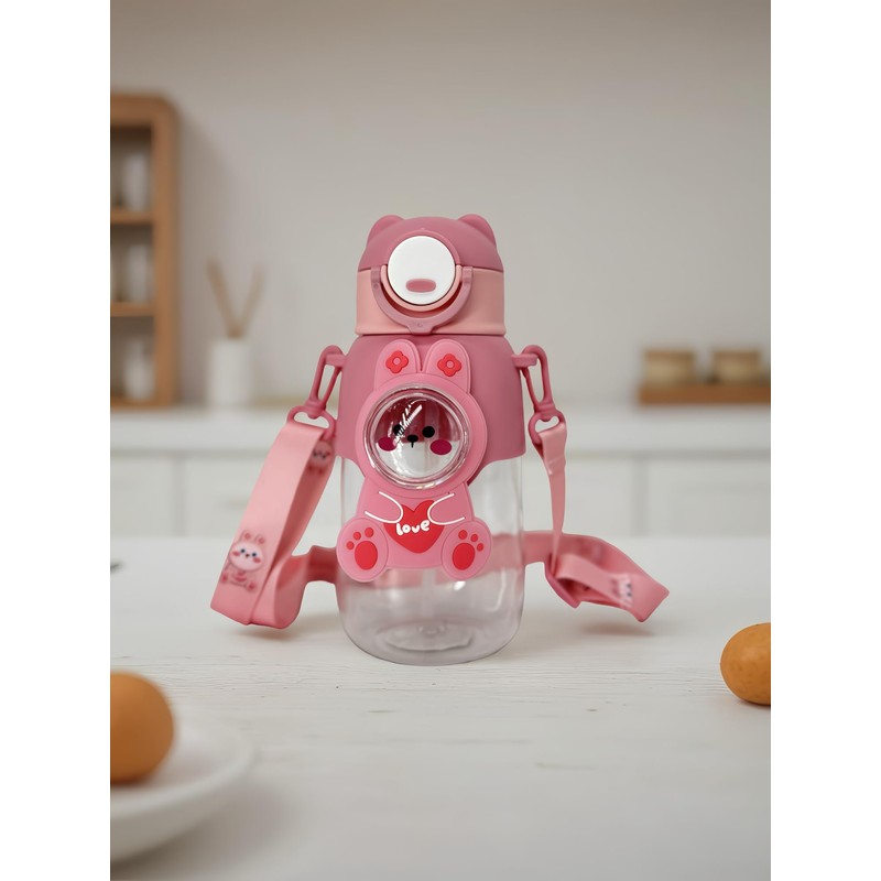 Cute Cartoon Water Bottle with Straw, Leak-Proof Design, Hand Washable, Shoulder Strap (PINK)