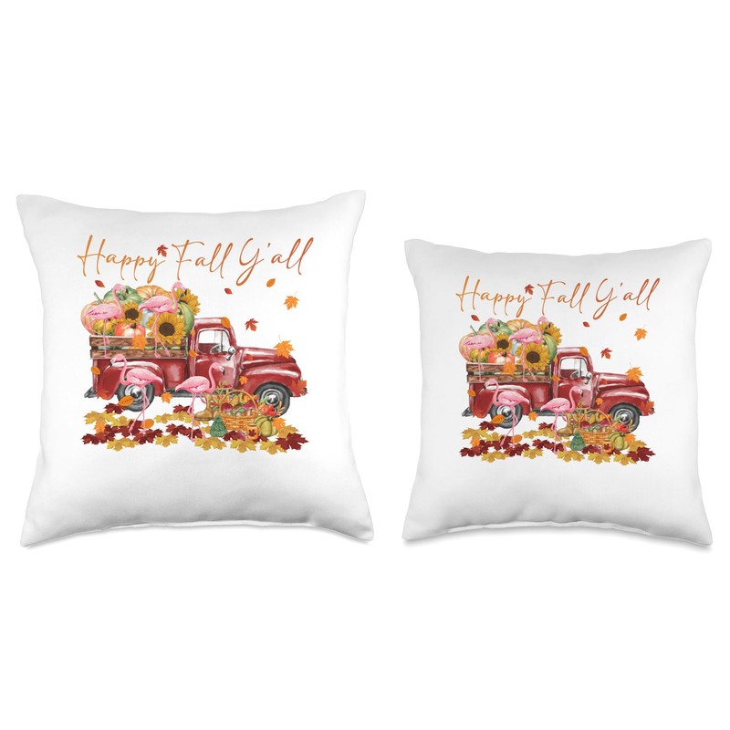 Cute Flamingo Pumpkin truck Happy Fall Y'all Throw Pillow