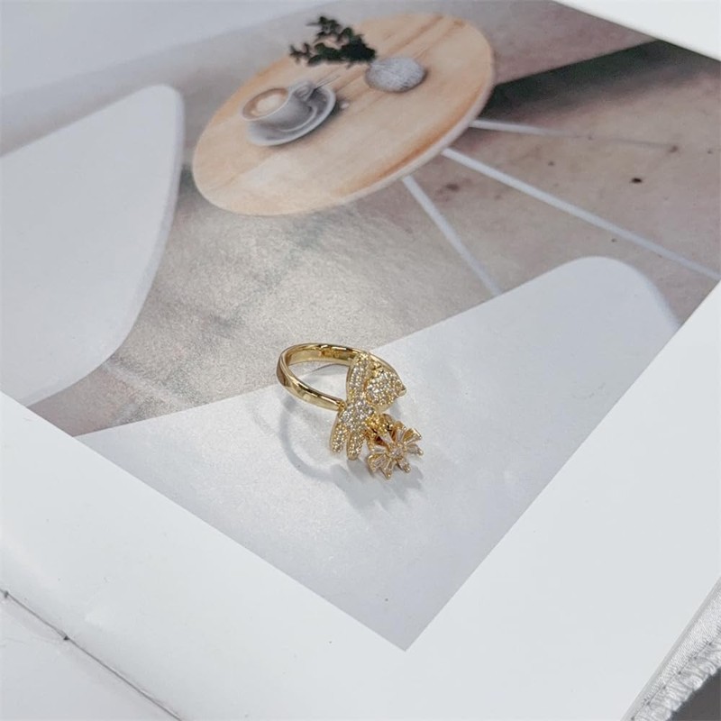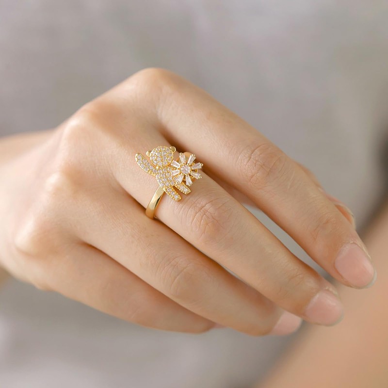 Cute Little Bear Rotating Flower Fidget Spinner Rings for Women Cubic Zirconia Anxiety Stackable Rotate Calming Worry Adjustable Open Ring Dainty Crystal Flower Band Fashion Relieve Stress Jewelry