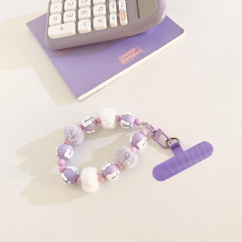 Cute Phone Lanyard Wrist Strap Tether Tab & Plush Pompom Key Chain Beaded Keychain Bag Charm for Women (Purple03)
