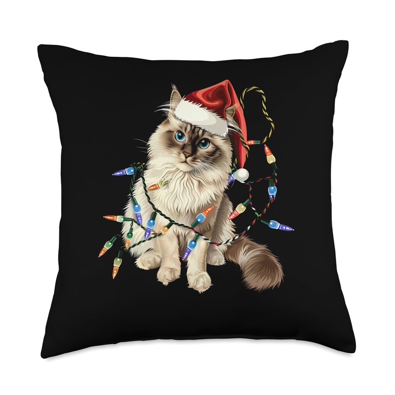 Cute Ragdoll Santa with Xmas Lights Christmas Cat Throw Pillow