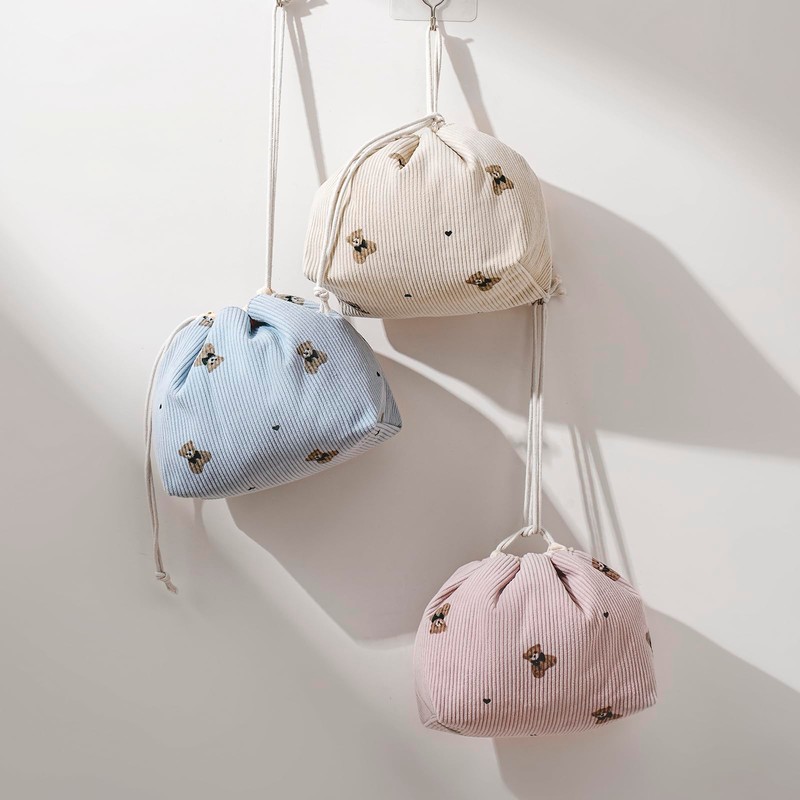 Cute Soft Corduroy Drawstring Makeup Bag with Canvas Lining, Coquette Aesthetic Drawstring Cosmetic with Bear Pattern for Women Girls, Kawaii Travel Makeup Organizer Case(01Pink Bear)