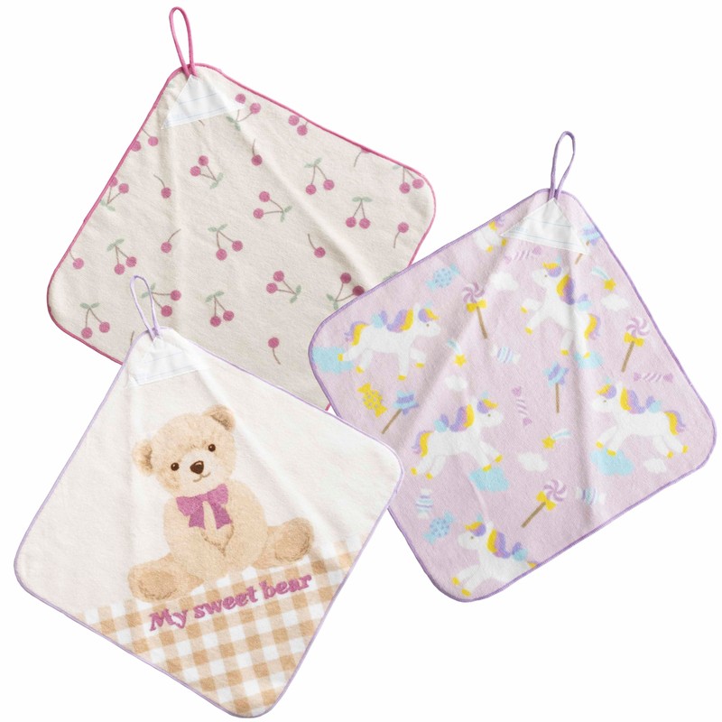 Cute Towel with Loop, Loop Towel, Name, Label, Hand Towel Set, Nursery School, Kindergarten, Children, 100% Cotton (B. Bear, Etc., 3 Pieces, Girl Pattern)