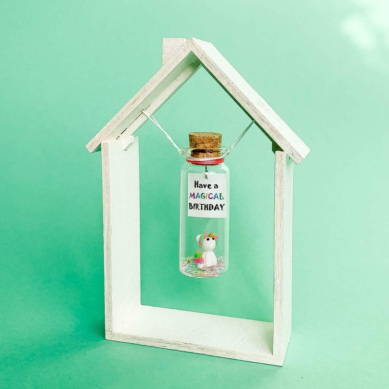 Cute Unicorn and Message in a Bottle, Tiny Decorative Jar with a Wish Card, Unique Present Idea for Her Birthday, Daughter and Niece Presents (hanging in a White Wood House, Have a Magical Birthday)