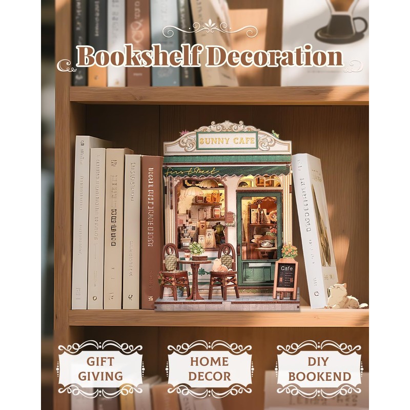 CUTEBEE Book Nook Kit - DIY Dollhouse Houses, Miniature House DIY Building Kit for Adults, 3D Wooden Puzzle Bookend Creative Set for Bookshelf Decoration Gift (Sunny Cafe)