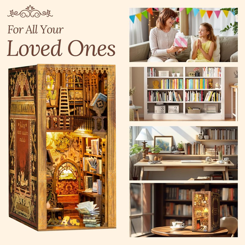 • 【FUN DIY EXPERIENCE】DIY BOOK NOOK comes with parts and needs to be assembled, not a finished product. Even if you are a beginner, the color manual can guide you step by step to complete the miniature kit. This diy dollhouse kit is suitable for people over 14 years old. Therefore it is a great way to communicate with teenagers and adults, and it can also inspire you to plan and build like a real engineer.