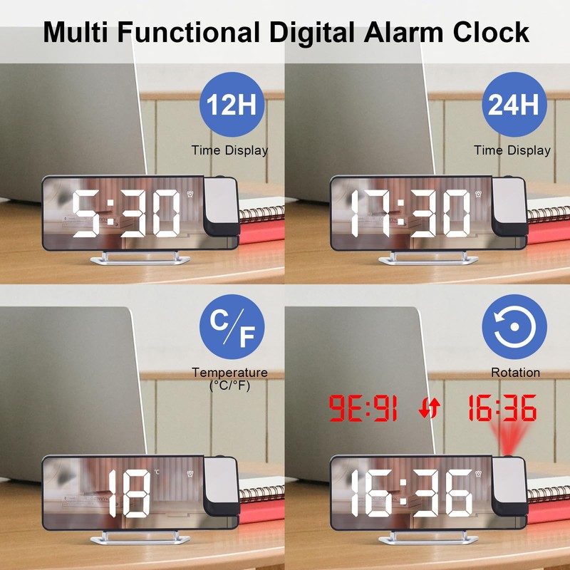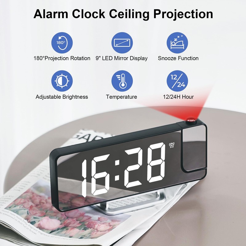 - 180° projection: the projector clock is designed with 180° adjustable angle and the best projection distance is 1.5-2.5 metres. The time can be projected on the wall or ceiling, and the projected numbers can be rotated, perfect for bedroom and living room, easy to read the time.