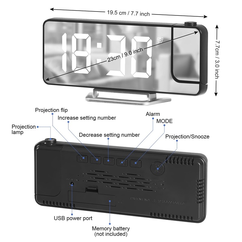 - USB and battery operated: this LED projection clock is powered by a USB power cable and 3 AAA batteries (batteries not included). It is recommended to connect it to a power source and insert the batteries. If it is powered by batteries only, the alarm clock goes into standby mode, you can press any button to light up the screen.