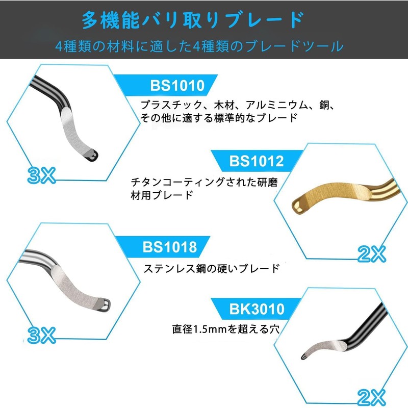 - (Frequently used Replacement Blades) 1 burr replacement bar, 10 replacement blades (3 BS1010 x 3 x BS1018 x 3 x BS1012 x 2 x BK3010 x 2 x BK3010). Simply lightly press the tip of the deburring knife to remove the blade and attach the spare blade