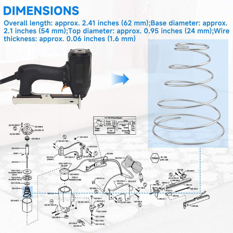 - Compatibility:The 72082 conical spring is suitable for electric carpet tacker(carpet stapler) and electric staplers used in carpet installation and furniture manufacturing. It replaces the GO-210-4 spring (part number 72082) and is compatible with ENC-5418 series electric carpet tackers, as well as EWC-5018G and EWC-5018A electric stapler models