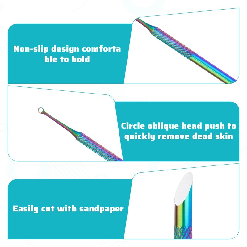 - Dual-Head Design: The spoon-shaped cuticle tool can push up the cuticles around the nails or push away the polishing gel residue after removal, cuticle scraper can easily push up stubborn dead skin, and can also be attached to the sandpaper to file nails.