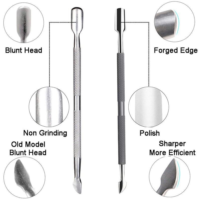 - 【Dual End Nail Pusher & Perfect for Cuticle Removal】Sharp to cut or scrape away dead cuticle on one end; Curved flat end perfectly pushes the skin back flawlessly; Durable metal resists wear and tarnish