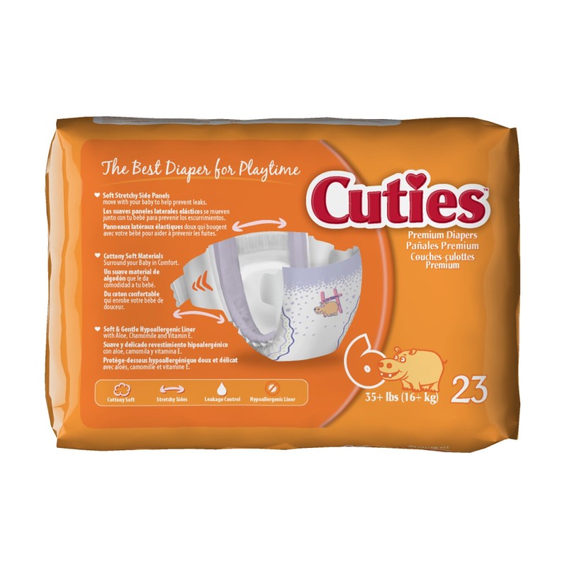 Keep your baby comfortable and dry with Cuties Baby Diapers. A winner of the Parent Tested Parent Approved (PTPA) Seal of Approval, these diapers offer exceptional leakage protection you can trust both day and night. Designed for maximum comfort and mobility for playtime and nap time, this diaper locks in wetness with a flexible ultra-absorbent core. Soft and stretchable waist and side panels move with your baby and help prevent leaks. Adjust the grip tabs for a secure fit. Cottony soft materials surround your baby in comfort. Free of latex, fragrance, dyes, and elemental chlorine, the hypoallergenic inner liner is enhanced with soothing aloe, natural botanicals, and vitamin E. Each box includes four packs of 23 diapers sized for babies weighing 35 pounds and up, for a total of 92 diapers.