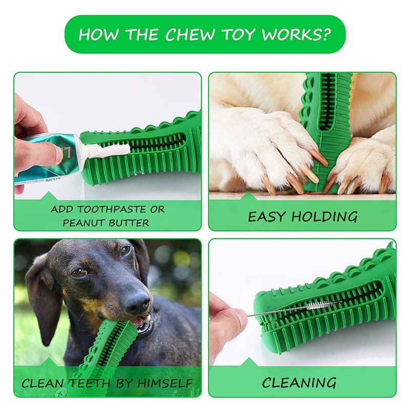 • Clean dog's teeth: As your dog chews, the bristles and ridges lightly abrade your dog's teeth, cleaning them in the process. You can even put some dog toothpaste in the mouth area to enhance the cleaning process. The bristles not only make for excellent dog tooth cleaners, but soft treat cradles as well.
