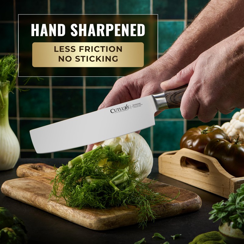 Transform your cooking experience with the Cutluxe 7-Inch Nakiri Knife, a durable, versatile, and aesthetically pleasing tool that embodies the essence of Japanese knives. Add this Japanese cleaver to your collection and enjoy effortless slicing and chopping.