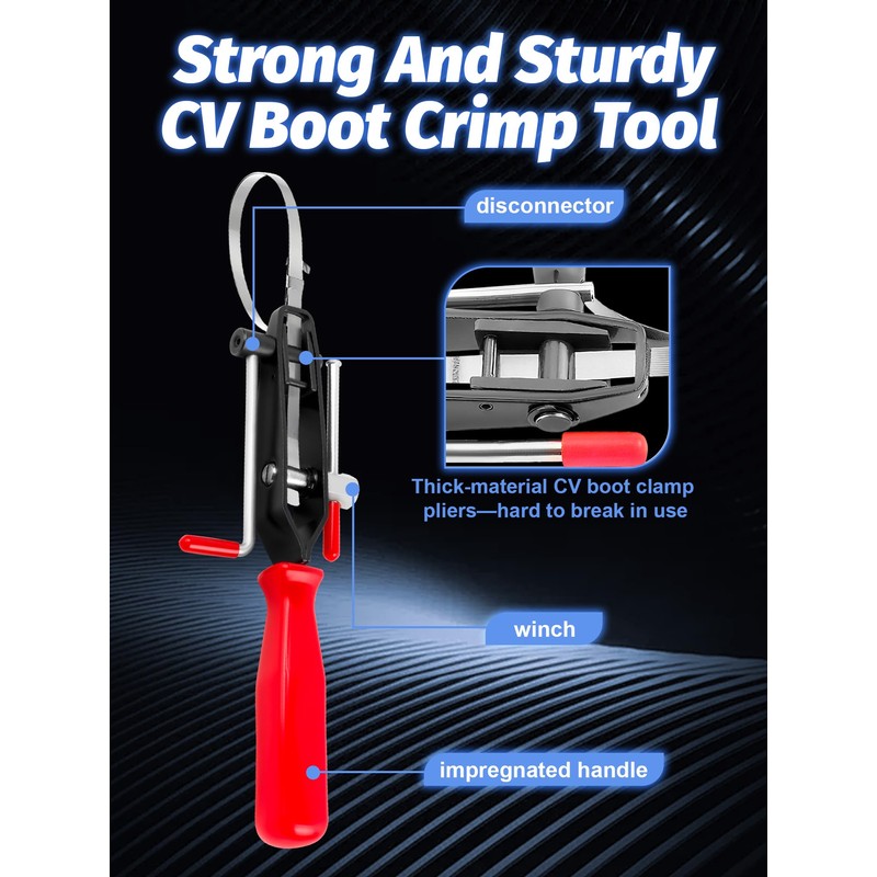 This axle boot clamp and CV joint clamp banding tool set can quickly and conveniently tension and secure the CV boot banding straps. The clamp size is adjustable, and the locking teeth can fix the strap at the desired length, with each pull making it tighter. The included tool can cut off the excess part of the strap.