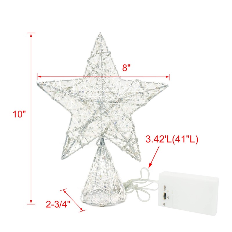 The wire of tree top star is extend to 3.42'L (41"), easy to use on higher Christmas trees, solid batteries box with flexible switch, New Upgrades design.