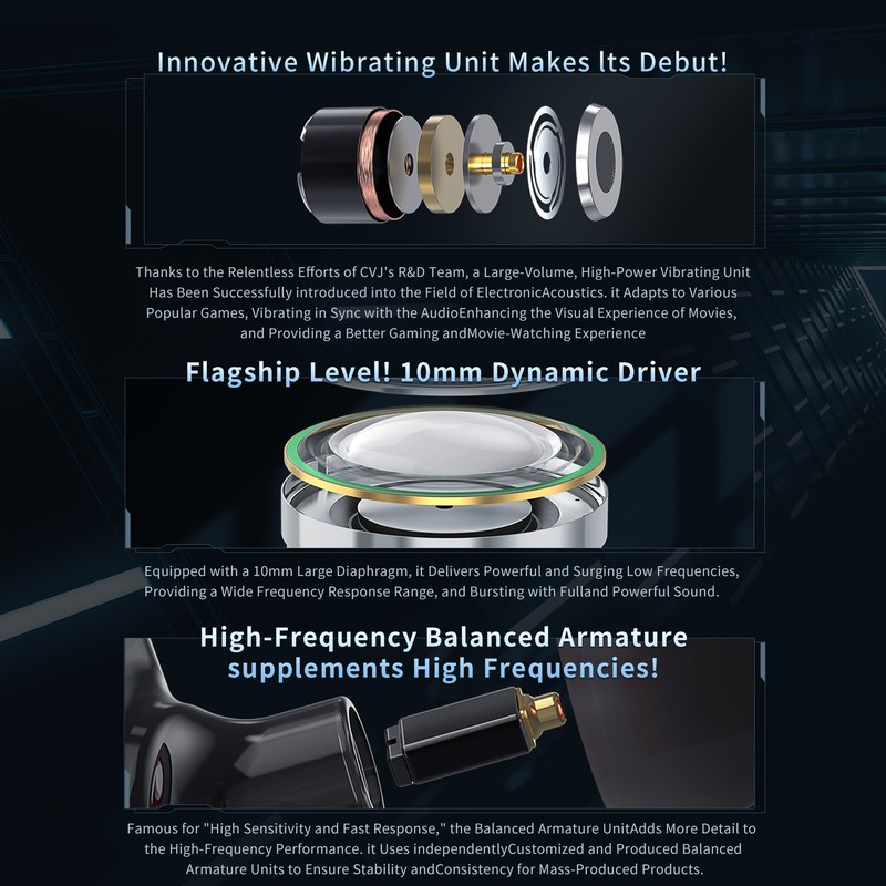 • New Configuration with Overloaded 3 Units-Dual Sound Output Channels Enhance Low Frequencies: CVJ's Continuous Innovation Empowers Konoka with 1 Flagship 10mm Dynamic Driver,a Brand-New Configuration - 1 New Vibrating Unit,and 1 High-Frequency balanced Armature,Creating a Three-Dimensional Stereo Sound Field. The Dual-Chamber Design with Dual Sound Output Channels Enhances the Width and Depth of the Sound Field. The External Vibrating Unit Effectively Supplements the Low Frequencies, Providing a Richer Atmosphere to the Sound.