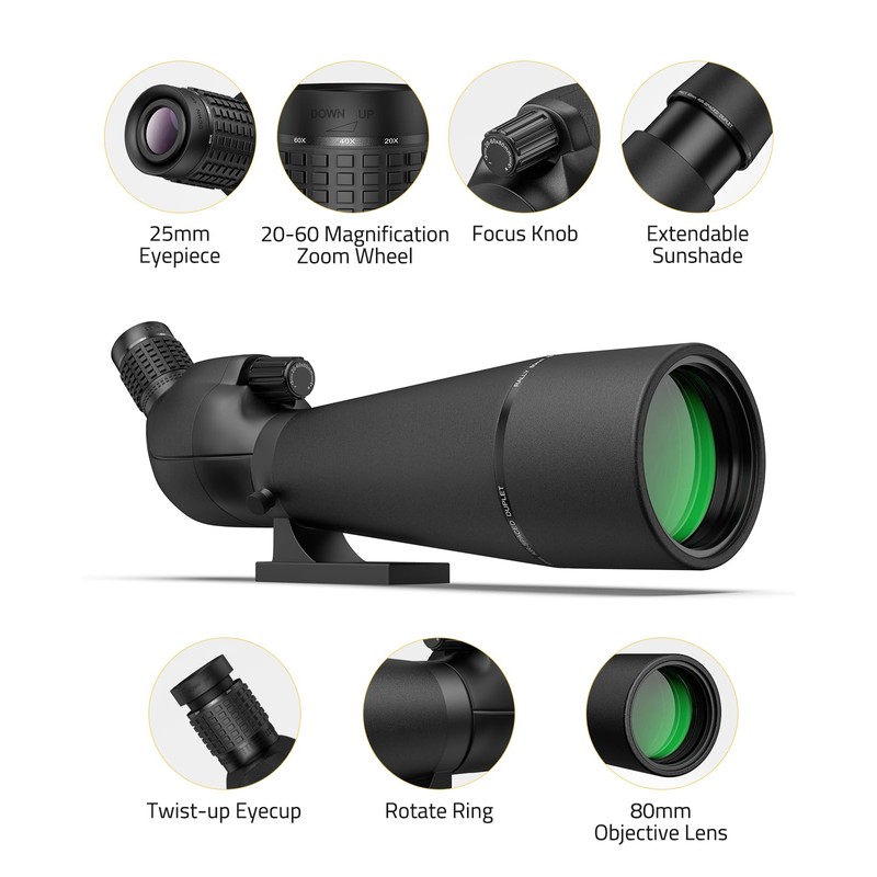 - Waterproof & Fog-Proof: Nitrogen-purged and O-ring sealed, this spotting scope is waterproof and fog-proof in wet environments. The solid framework and rubber armor provide a non-slip grip, shock resistance, and enhanced durability. The eyepiece shield can be extended to protect the eyepiece, and a built-in retractable sunshade reduces glare