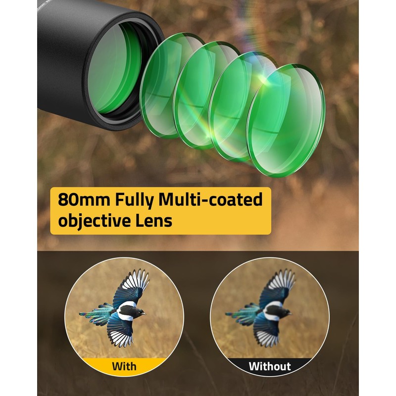 - 80mm Extra-Large Objective Lens: The fully multi-coated 80mm green film objective lens provides a wide field of view of 52.5–19.25 ft at 1000 yards. Our spotter scope uses premium BAK4 roof prism optics to enhance light transmission for improved clarity and low-light performance