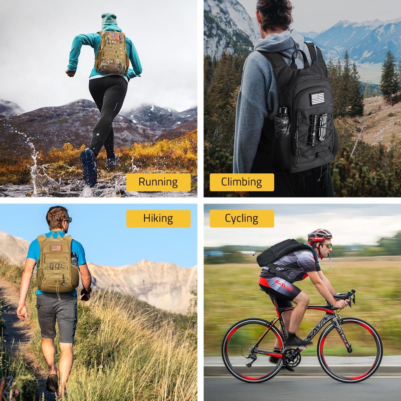 - MOLLE System & Elastic Cord: There are 5 MOLLE woven straps designed on the outside of the backpack, which can be used to hang tactical equipment, such as tactical bags, sunglasses, D-buckles, etc. The hydro backpack is also designed with elastic cords, which can be used to fix towels, picnic mats, etc.