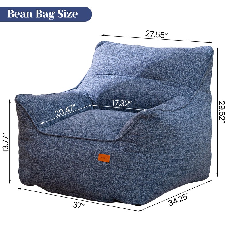- Ergonomic Design: The adult bean bag chair stuffed high quality, high-density and high resilience sponge foam, designed with ergonomic backrest and two large armrests, which make sitting or lying more supportive. The cozy bean bag chair sofa measures 37" x 34.25" x 29.52", which is spacious enough to fit any body type, and great for adults, teenagers.