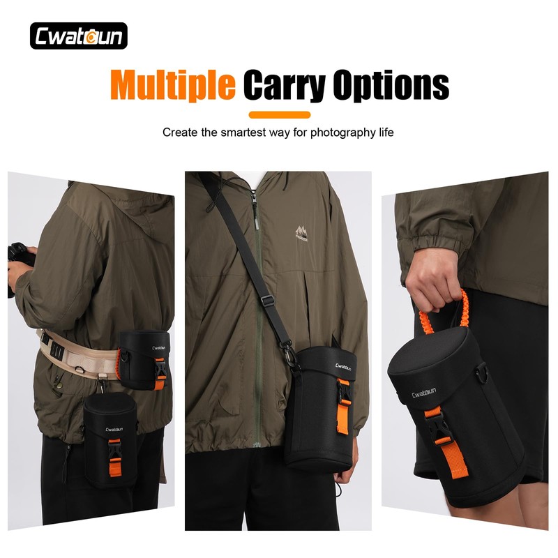 - 【EASY TO CARRY】: Multiple ways to carry camera lens pouch: 1; Use the adjustable shoulder strap with non-slip pads. 2; Carry it by hand with the top woven grab rope. 3; Rear double-touch belt loop for the waistband. 4; Attach the lens pouch to the bag with the included hiking buckle.