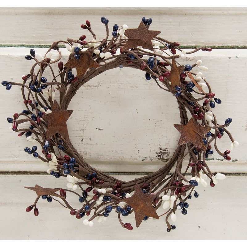 CWI Gifts 4-8" Colonial Mix Pip Ring w/Rusty Stars. Pip berry rings are versatile pieces that can be used as candle rings or mini wreaths. Hand- wrapped brown floral wire with small rusty stars and navy, burgundy and mustard berries. The wreath is 8" with a 4" opening.