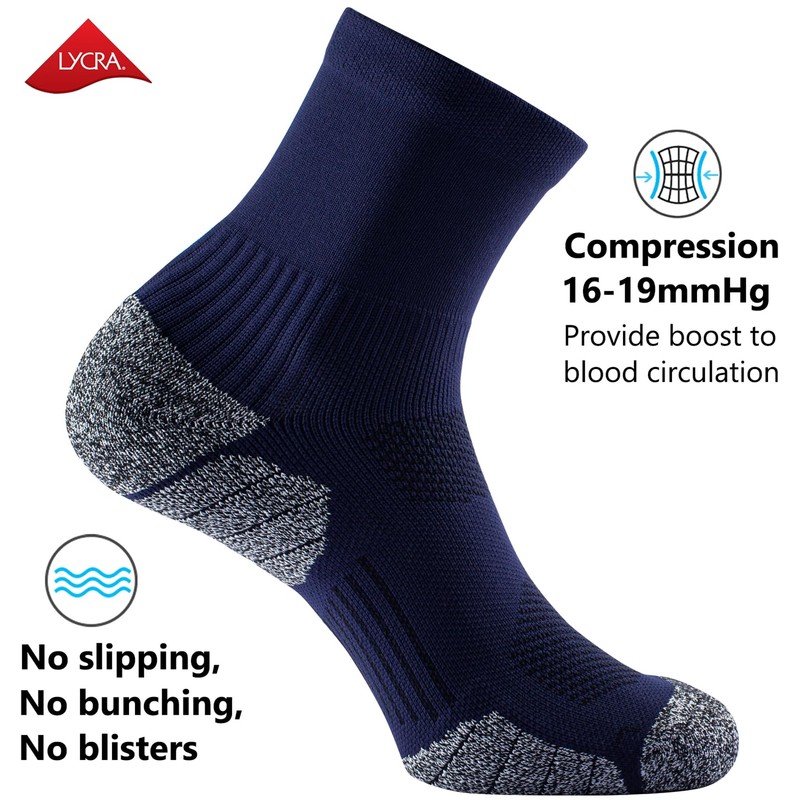 • COMPRESSION FIT: Sport socks with targeted compression (16-19 mmHg) to provide boost to your blood circulation, anti-swelling, arch support, fit your feet perfectly and no slipping, no bunching, no blisters