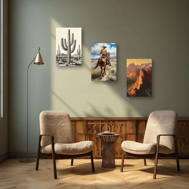 CXHOSTENT Western Cowboy Wall Art Southwestern Wall Decor Cowboy Canvas Art 3 Pieces Boho Cactus Canyon Pictures Rustic Country Decor Framed (11x14inchx3Pcs)