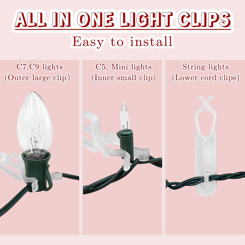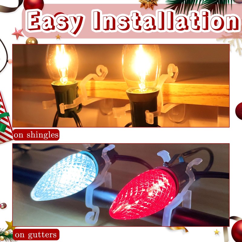 - 200Pack Christmas Lights Clips: Enough for you to decorate your whole house, accommodate with E12, E17 base and other mini lights string, translucent, no standing out during night displaying.