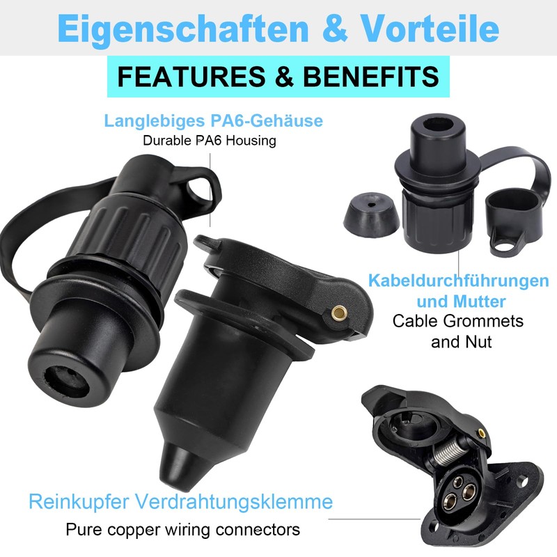 - ✔ Universal 3-pin trailer plug and socket – connections standardised according to ISO 11446. This 3-pin trailer socket is made of high-quality nylon and copper, waterproof, stable and practical. This 3-pin trailer plug perfectly solves the problem of 3-pin signal transmission between your car and trailer.