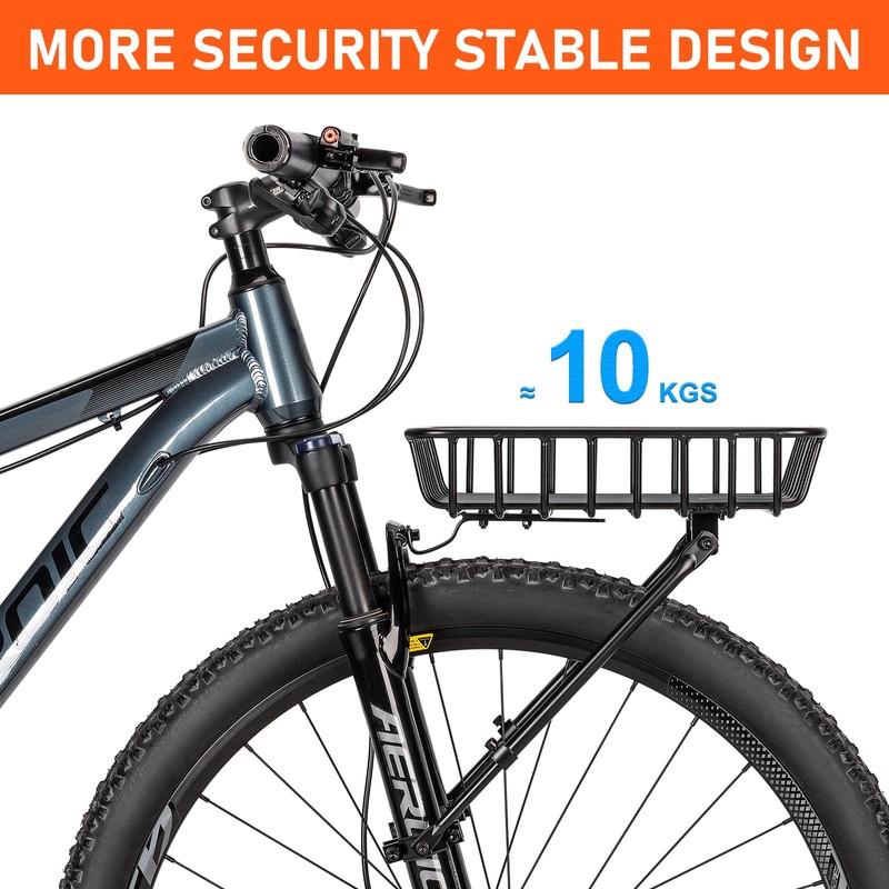 - 【Solid & Sturdy】: This bike front basket rack is constructed with durable 6061-T6 aluminum, the rack maintains stiffness without weighing your frame down. Recommended maximum load for the basket is 10 kg/ 22lbs in total. DO NOT overload Basket. Overloading Basket or not securing item(s) in basket may cause difficulty in steering and/or loss of bicycle control which could result in injury.