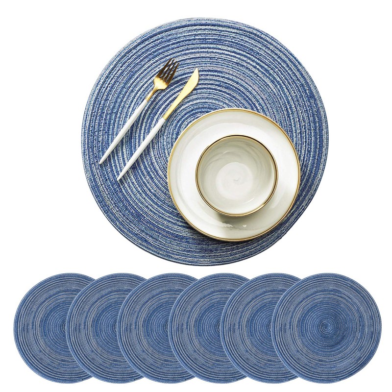 CY SISTERS 15Inch Round Placemats Farmhouse Boho Placemats Cloth Placemat Rustic Woven Placemats for Dining Table Set of 6 Circle Placemats Linen Braided Placemats Washable Outdoor Blue Table Mats