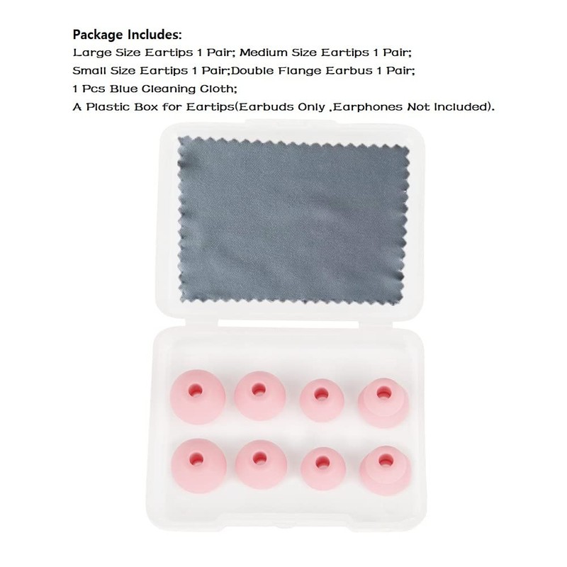 • 【Package Includes】Large Size Eartips 1Pair,Medium Size Eartips 1 Pair,Small Size Eartips 1 Pair,Double Flange Earbus 1 Pair;1 Pcs Blue Cleaning Cloth;A Plastic Box for Eartips(Earbuds Only ,Earphones Not Included).