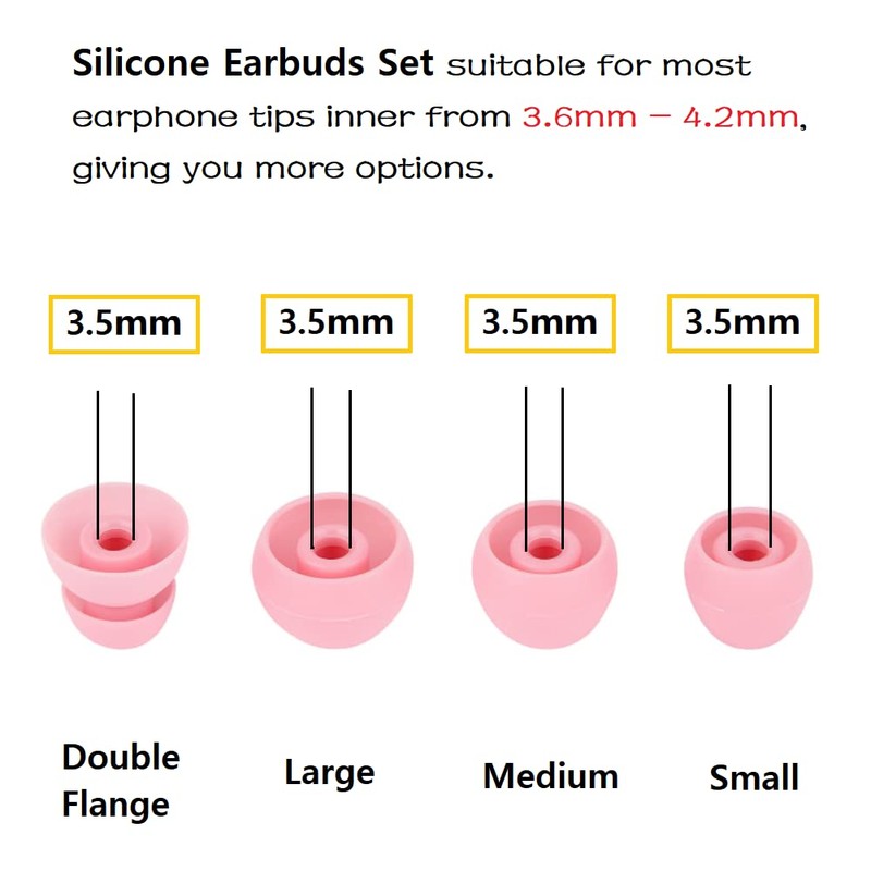 Double flange ear tips is:13mm (external), internal size fits earbuds with diameter from 3.6mm - 4.2mm.