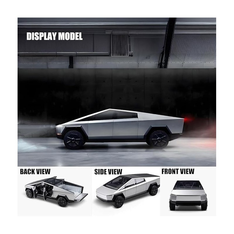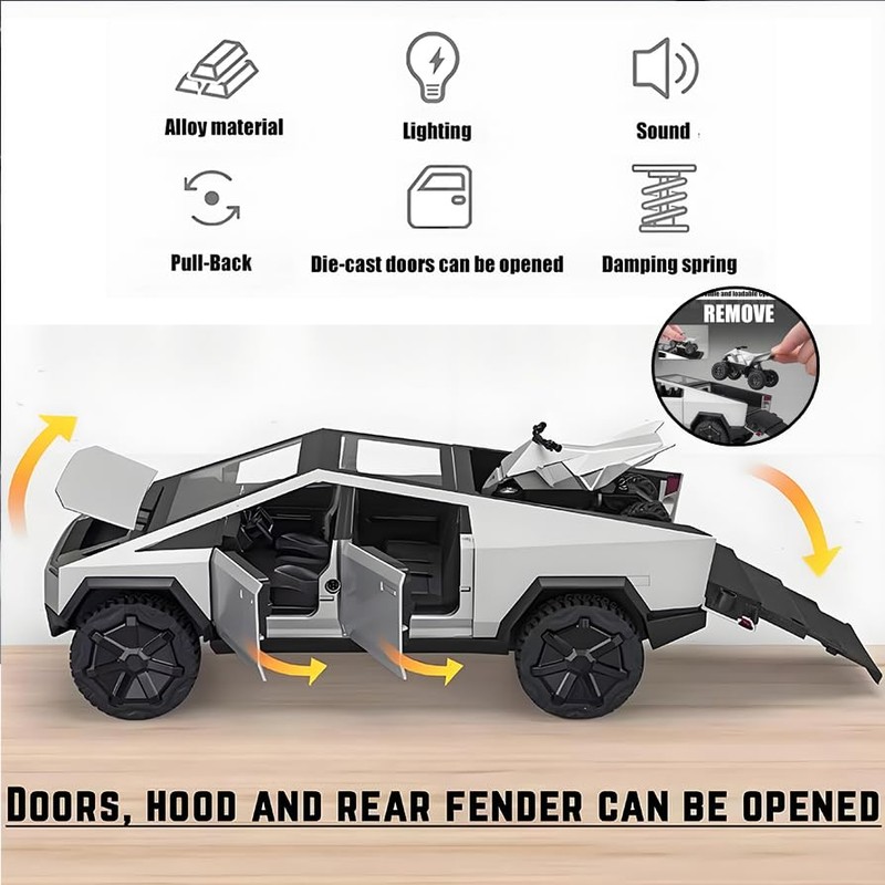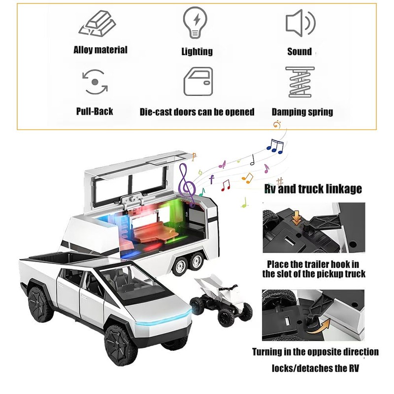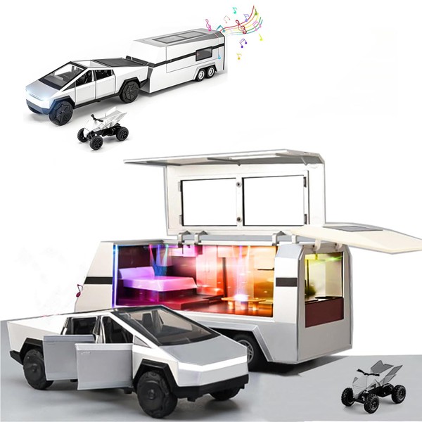 Cybertruck Toy Model with RV Motorcycle Cyberquad Alloy Die-cast Model Car Pickup 1/32 Toy Race Cars with Sound and Light Effect Ideal Gift for Kids Adult Age for 3 YearOld and Up (Silver)