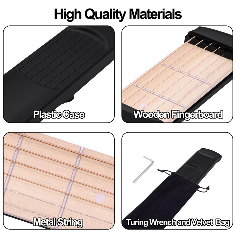 - High Quality Materials: Guitar practice tools are made of plastic shells, wooden fingerboards, and metal strings. Plastic shell is moisture-proof, sturdy and durable; The wooden fingerboard is finely crafted, comfortable and sweat absorbing, and can be used for a long time; The metal strings simulate the feeling of a real guitar, ensuring a realistic playing experience.