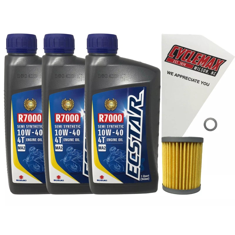 - CYCLEMAX OIL CHANGE KIT INCLUDES: Three Suzuki 990A0-01E30-01Q ECSTAR R7000 10W40 Quarts of Oil, One Suzuki 16510-25C00 Oil Filter, One 12mm Drain Plug Crush Washer and a Convenient Disposable Funnel.