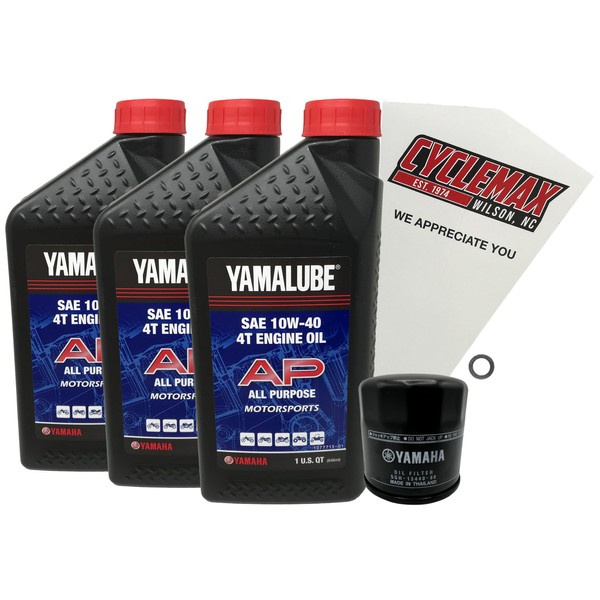 • CYCLEMAX KIT INCLUDES: Three Yamaha LUB-10w40-AP-12 Yamalube 10W40 Quarts of Oil, One Yamaha 5GH-13440-80-00 Oil Filter, One 14mm Drain Plug Crush Washer and a Convenient Disposable Funnel.